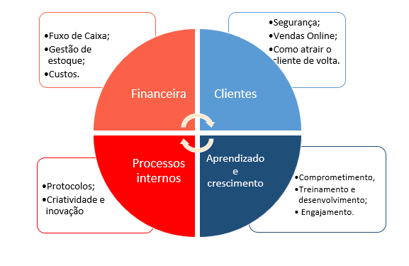 Perspectiva dos Processos Internos: Nesta perspectiva deve ser colocado os protocolos que estão sendo criados para operacionalizar a retomada. Os processos estão mudando muito rapidamente, com a implantação dos protocolos de segurança, automatização ou até eliminação de algumas tarefas que não sejam mais necessárias neste momento.